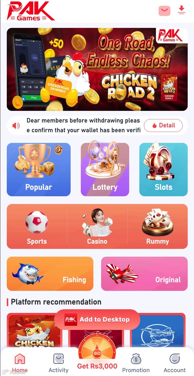 以巴基斯坦的Pak Paisa、Pak Games等平台为代表,其共通策略并非依赖复杂玩法,而是将“小额即时提现+本地钱包”打造为用户信任的核心检验标准。平台在用户满足条件后优先开放小额提现通道(对接Easypaisa/JazzCash),并在UI设计与推广文案中反复强调“快速到账、支持本地钱包”,并在应用商店和下载页面重点展示该功能。