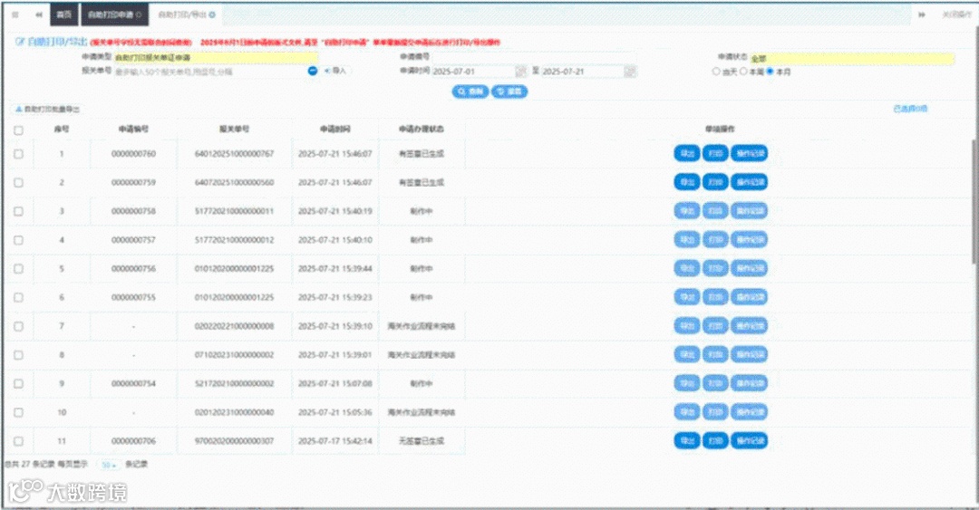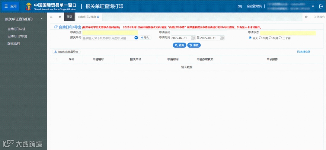 查询。点击左侧菜单“自助打印/导出”,通过报关单号或申请日期查询已提交的打印申请。