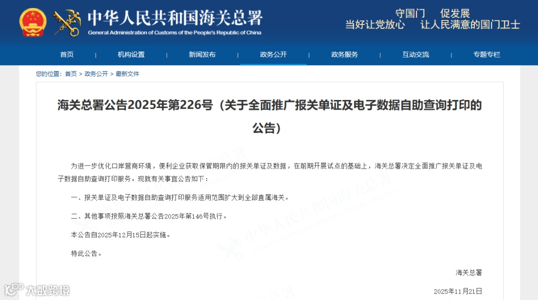 近日,海关总署发布2025年第226号公告,宣布自2025年12月15日起,在全国所有直属海关全面推广报关单证及电子数据自助查询打印服务。