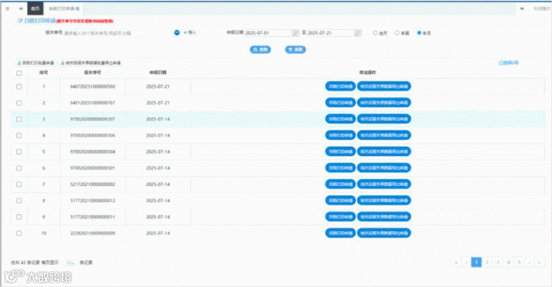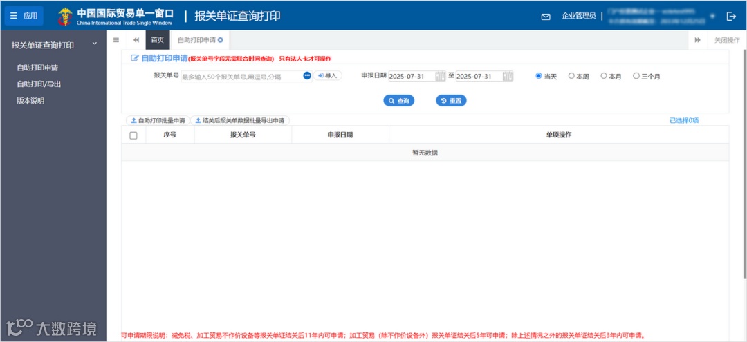 申请。在左侧菜单栏点击“自助打印申请”,通过输入报关单号或选择申报日期范围进行查询。单次查询时间跨度不得超过3个月。