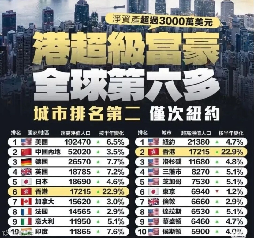 按净资产超3000万美元标准统计,香港在全球城市中排名第二,仅次于纽约 [2] 。叠加内地5.2万名同类人群,香港已成为中国财富版图中的核心节点 [2] 。