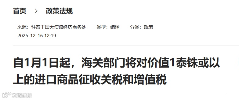 泰国海关宣布自2026年1月1日起,泰国将对价值1泰铢及以上的所有进口商品统一征收关税和增值税(VAT),终结此前针对小额进口商品的关税豁免待遇。