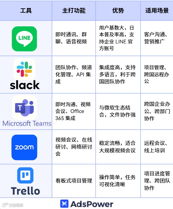 今天就从日常沟通、团队协作、视频会议到项目管理四大方面入手,拆解 5 款日本出海沟通的核心工具,结合 AdsPower 解决多账号运营痛点,助力跨境人高效布局日本市场。