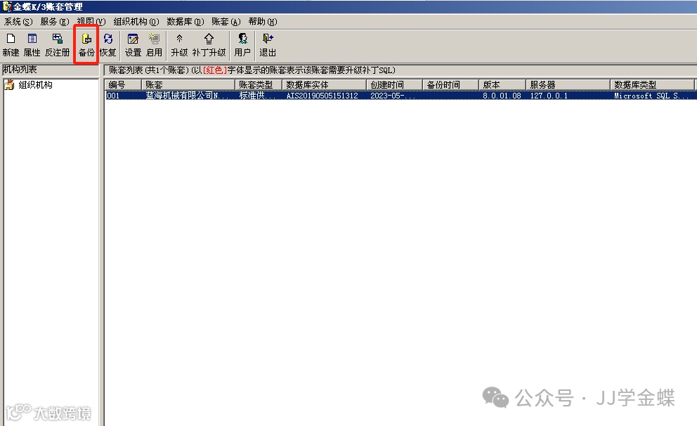 3、账套列表中点中需要备份的账套,点工具栏【备份】