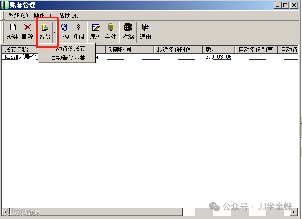 1、金蝶KIS商贸版6.1及先前版本的账套备份: