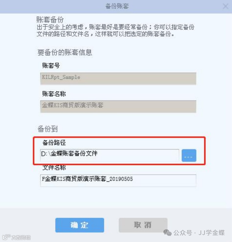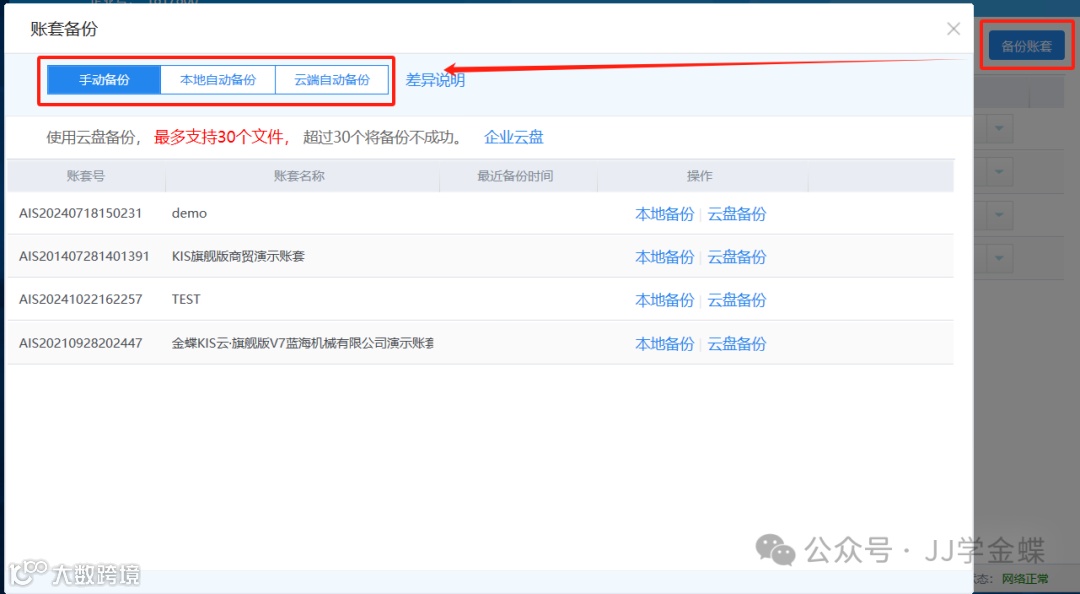 选择备份账套保存位置,建议勾上【备份到企业云盘】,点击【备份】按钮,这样在本地路径和金蝶企业云盘中同时进行备份。