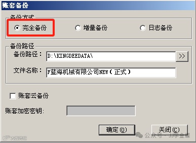 4、选择完全备份和备份路径,录入备份文件名称,确定。