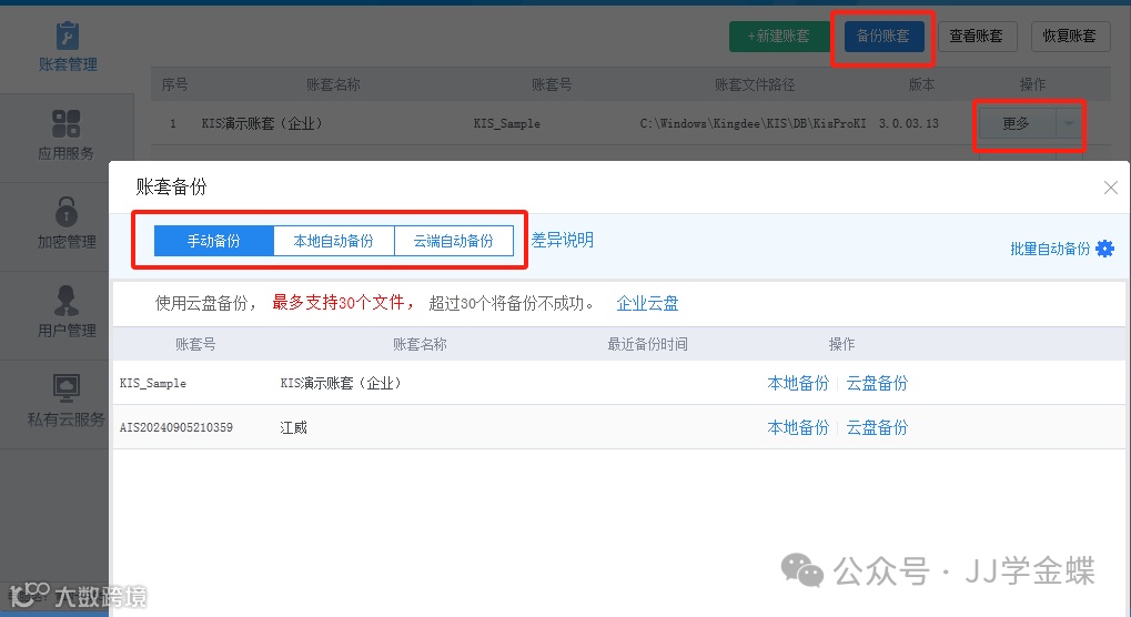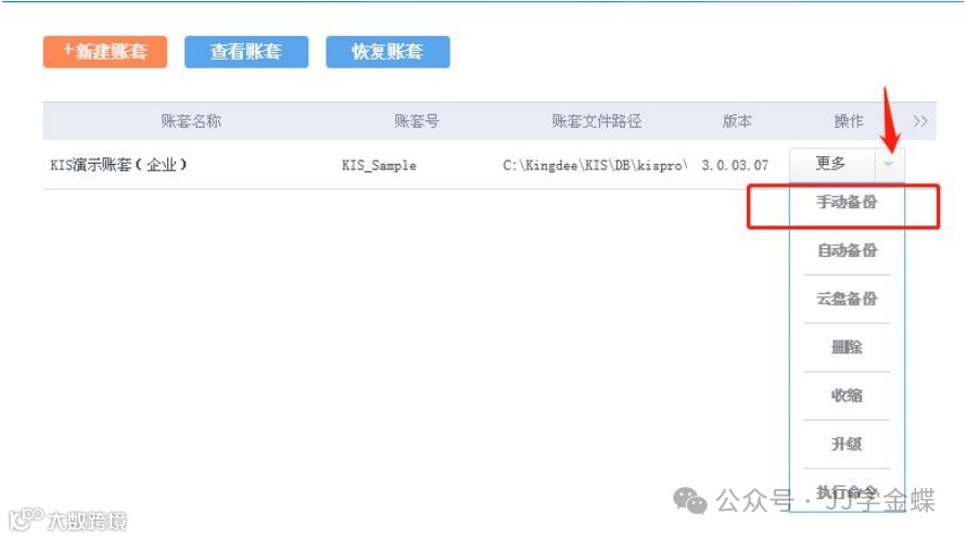 服务器电脑右下角任务栏双击打开【金蝶KIS专业版系统管理】-账套后面-更多-手动备份,如下图所示: