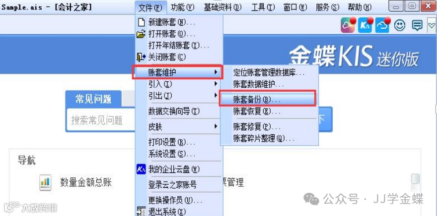 软件主界面右上角【文件】 -【账套维护】-【账套备份】,