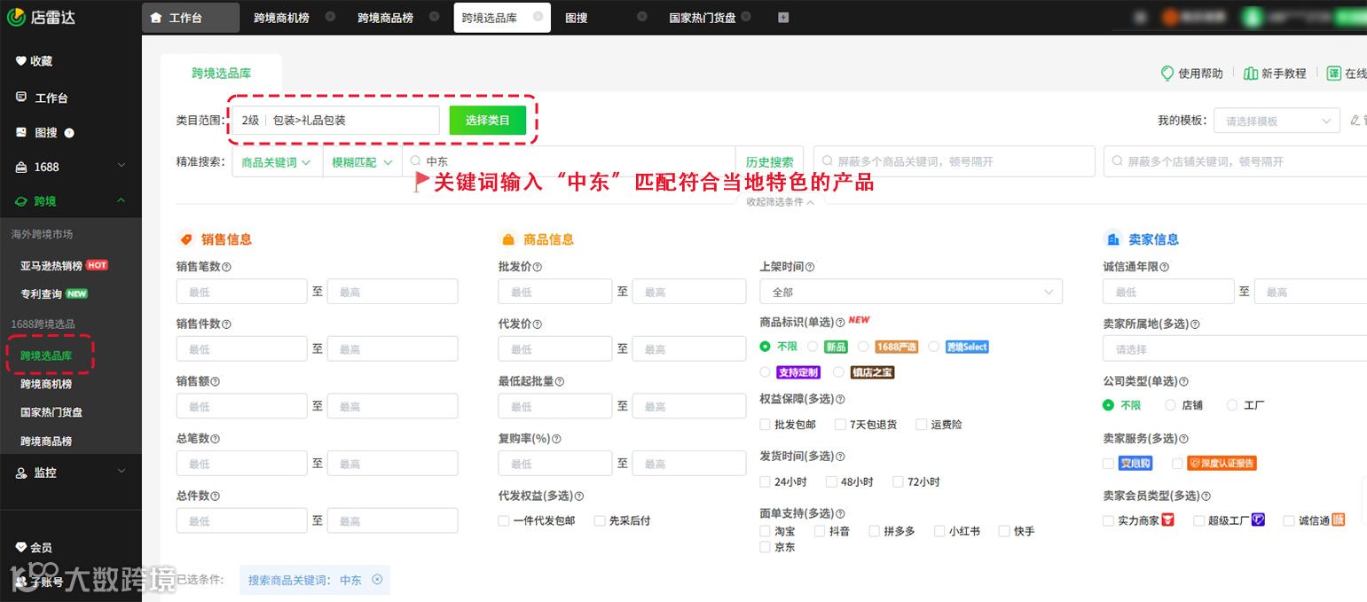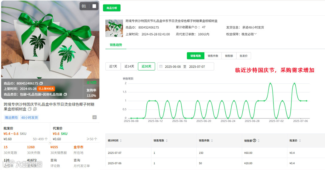 通过店雷达跨境选品库,选择礼品包装类目,关键词可以输入“中东”等符合当地特色的词语进行筛选,例如临近印尼国庆节,这款沙特国庆礼品盒,查看商品分析发现近期采购数量增加,符合市场需求。