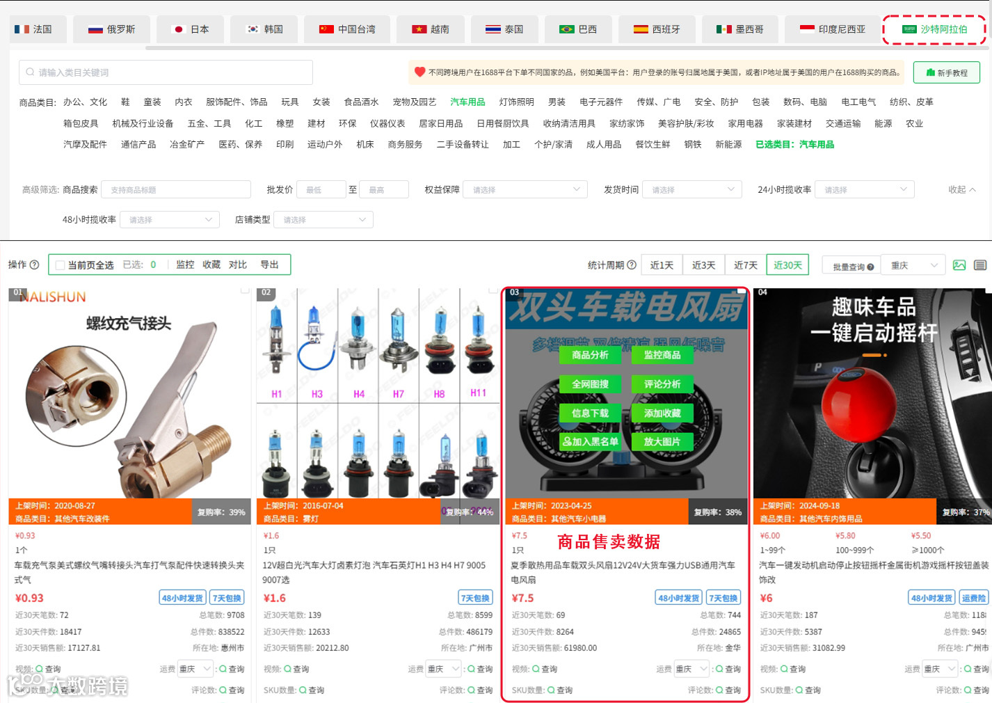 我们还能通过国家热门货盘直接了解沙特阿拉伯下游热卖品情况,以汽车用品为例,选择近30天即可知晓1688跨境上不同商品的售卖数据,进而找到受用户喜爱的产品进行上架销售。