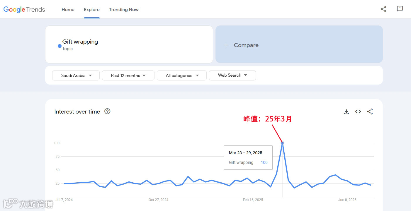 我们可以利用Google Trends看市场趋势变化,观察类目关键词的波动情况。以“Gift wrapping”关键词为例,可以看出近12月呈现规律波动,需求稳定,其中在25年3月出现峰值,说明是节日或者季节性爆品,那么我们就可以提前做好布局,抢占先机。