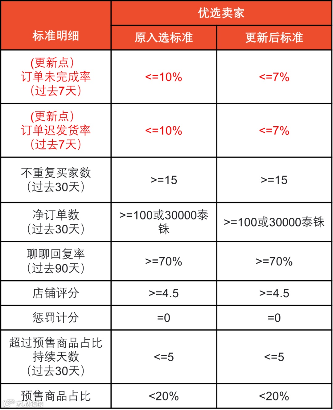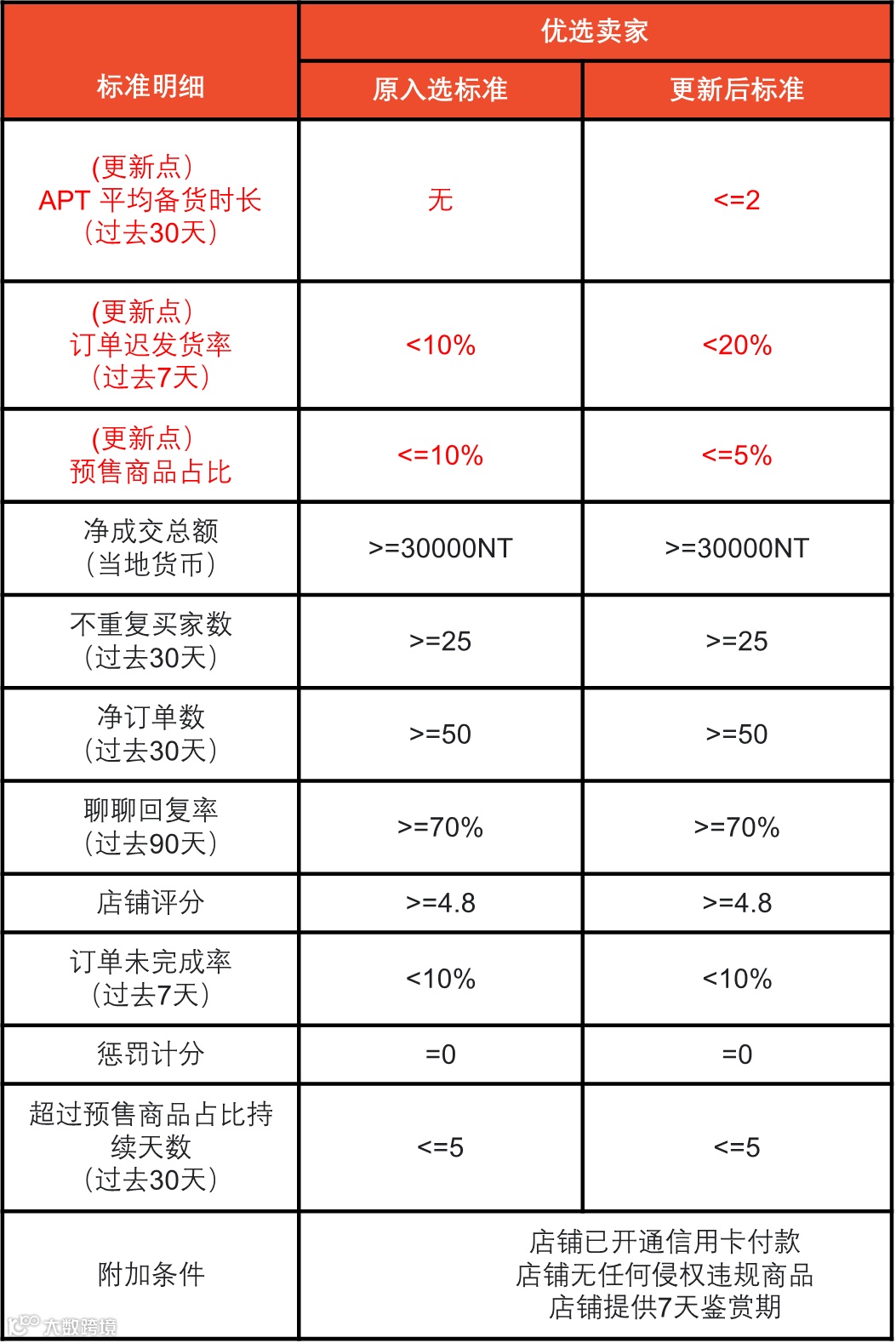 自2024年3月4日起,台湾站点将调整优选卖家标准及专属福利,原“优选+卖家”等级将被取消。