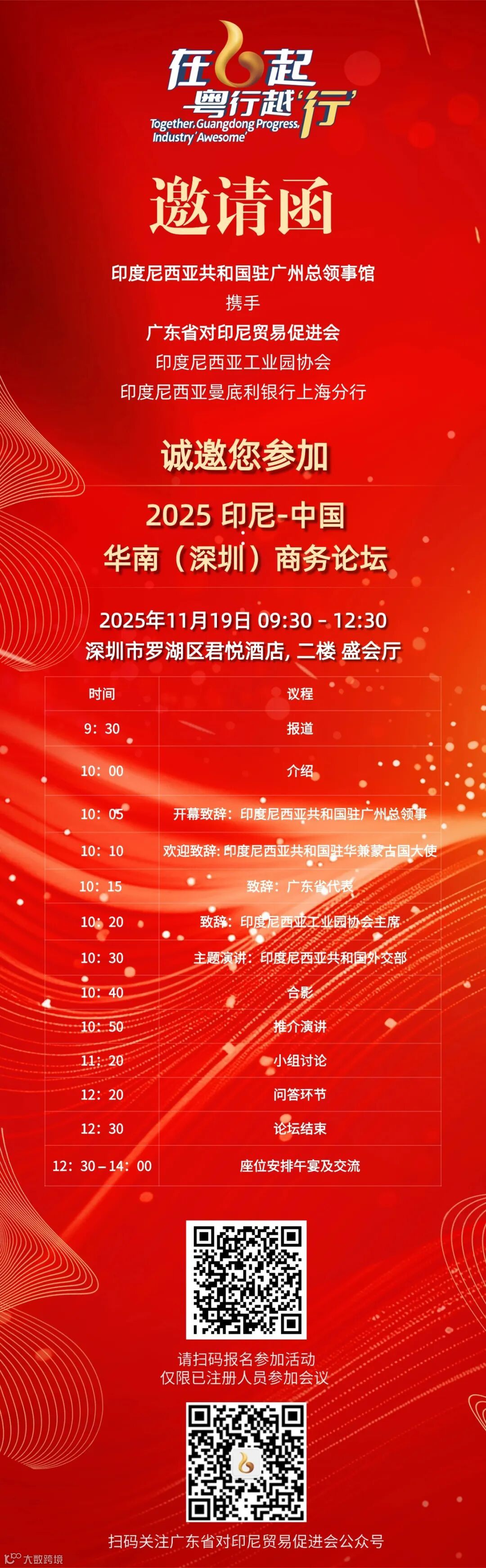 印度尼西亚共和国驻广州总领事馆携手广东省对印尼贸易促进会,印度尼西亚工业园协会,印度尼西亚曼底利银行上海分行 诚邀您参加 2025 印尼-中国华南(深圳)商务论坛。
