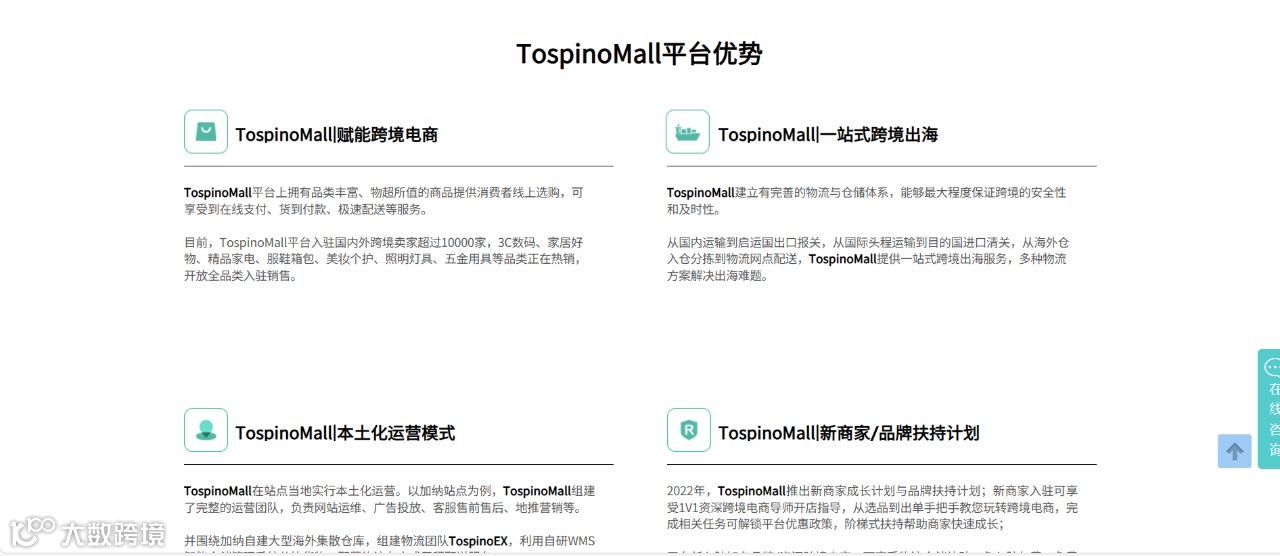 Tospino提供一站式服务,包括智能跨境平台、仓储、物流、大数据分析等,为商家提供全方位的支持,简化了跨境电商的复杂流程;