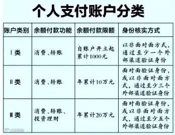 根据规定,Ⅰ类账户仅需一个外部渠道验证身份,如联网核验身份证,年累计余额支付限额为1000元;Ⅱ类账户需通过至少3个外部渠道验证,年累计限额10万元;Ⅲ类账户需5个以上渠道验证,年累计限额20万元。