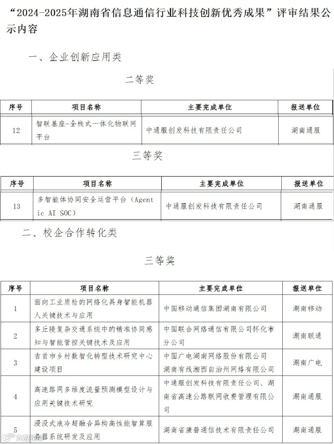 近日,2024-2025年湖南省信息通信行业科技创新优秀成果评选结果揭晓。创发公司打造的“智联基座-全栈式一体化物联网平台”、“多智能体协同安全运营平台(Agentic AI SOC)”分别获企业创新应用类二等奖和三等奖,“高速路网多维度流量预测模型设计与应用关键技术研究”获校企合作转化类三等奖。