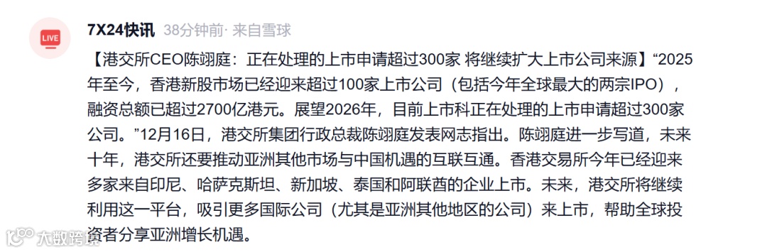 , 港交所CEO展望2026年说,目前正在处理的上市申请,已经超过300家。