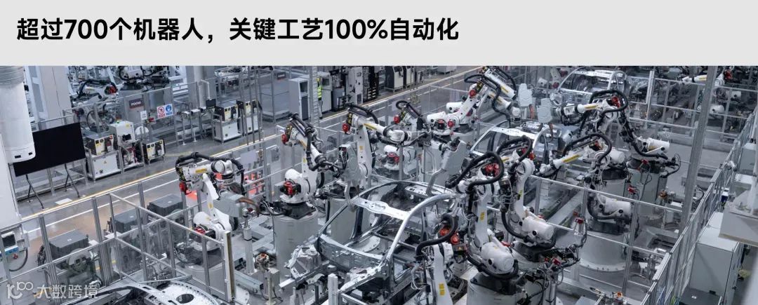 车身车间综合自动化率达91%,配备400多台机器人与400多个高精度摄像头,支持黑灯生产。机器人承担点焊、自冲铆接、热融自攻丝、涂胶等工序,保障车身高强度。