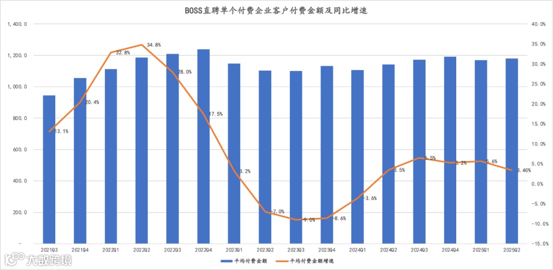 BOSS直聘当前仍主要依赖付费企业客户数量增长驱动营收。截至2025年6月30日的十二个月内,付费企业客户达650万家,同比增长10.2%。