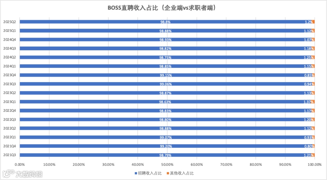 市场常认为招聘平台是“旱涝保收”生意,实则不然。BOSS直聘99%的收入来自企业端,自2021年上市以来该比例始终稳定,面向求职者的收入几乎可忽略。