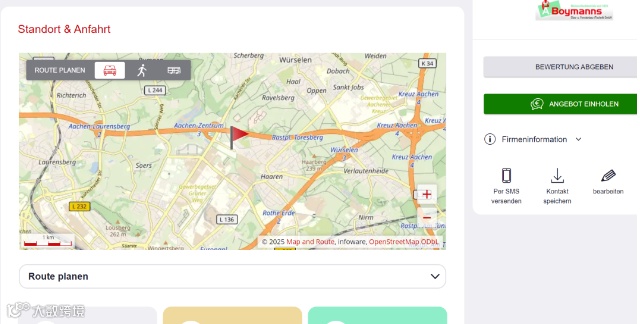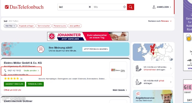 企业搜索(Firmensuche):支持按行业、公司名称或地址查找企业。例如输入“led”,可检索柏林地区的灯具企业,获取其地址、电话、邮箱、官网及营业范围等基础信息。