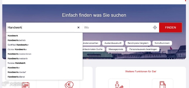 行业分类目录:提供按字母排序的行业目录,支持关键词搜索(如“Handwerk”),便于快速筛选目标行业企业。