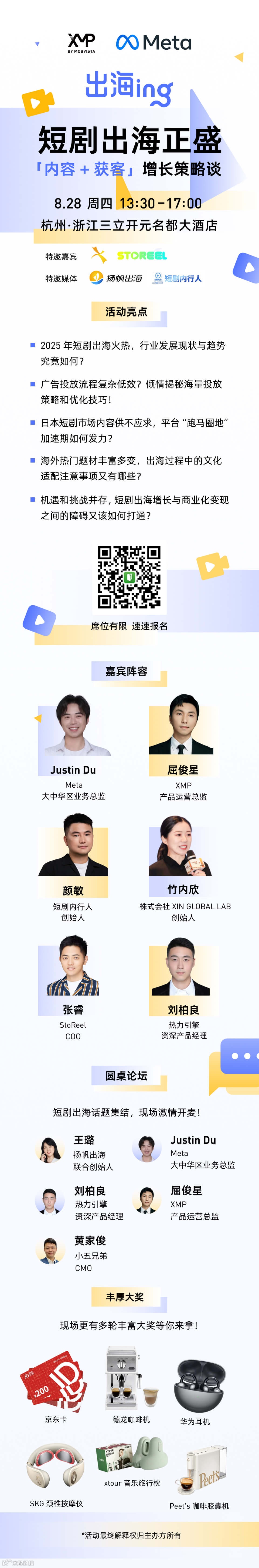 8月28日,XMP、Meta、StoReel、株式会社XIN GLOBAL LAB、扬帆出海、短剧内行人、热力引擎、小五兄弟等业内专家将齐聚杭州,围绕爆款内容选题、平台投放策略、广告买量与数据运营等核心议题,分享实战经验,助力开发者破局增长。
