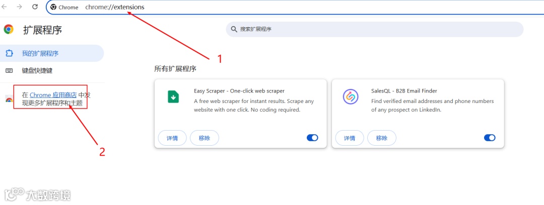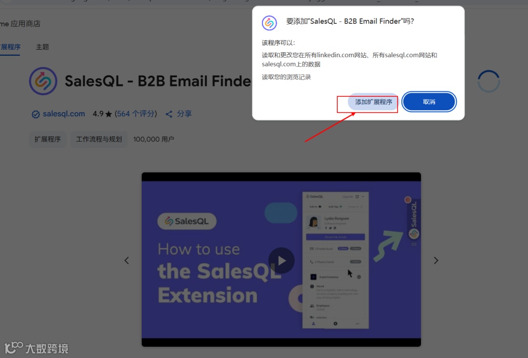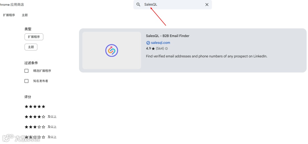 chrome://extensions/或直接访问 Chrome 网上应用店; - 在搜索框中输入 “SalesQL”,确认发布者身份,选择官方扩展程序;