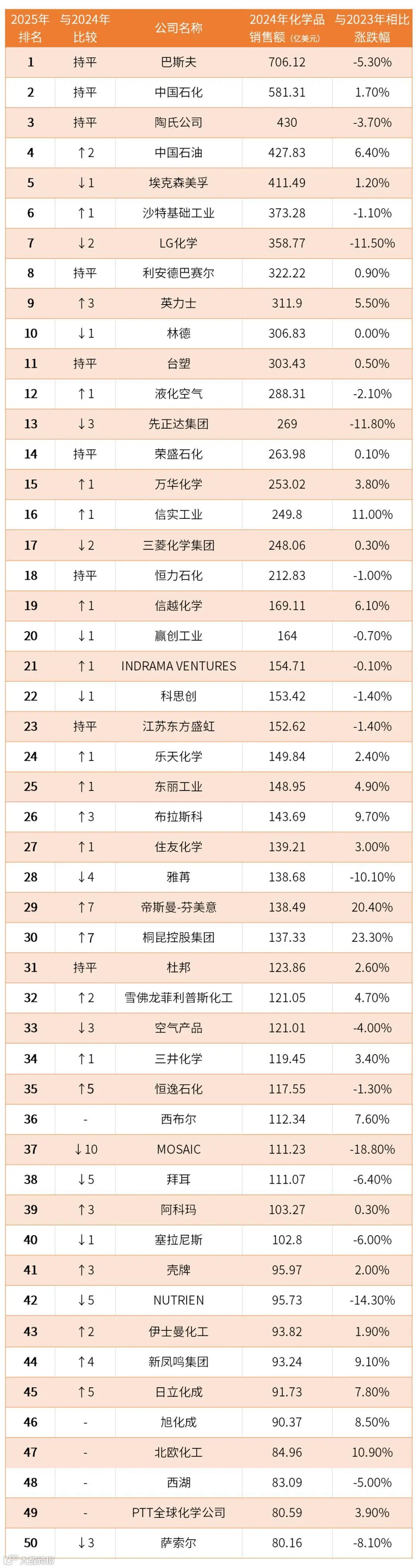 2025年全球化工企业50强榜单发布:中国化工企业增长放缓,国际巨头加速战略转型