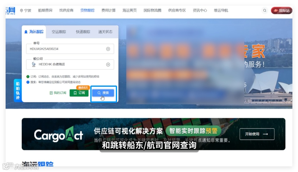 点击搜索,帮您准确定位到船公司官网查询动态: