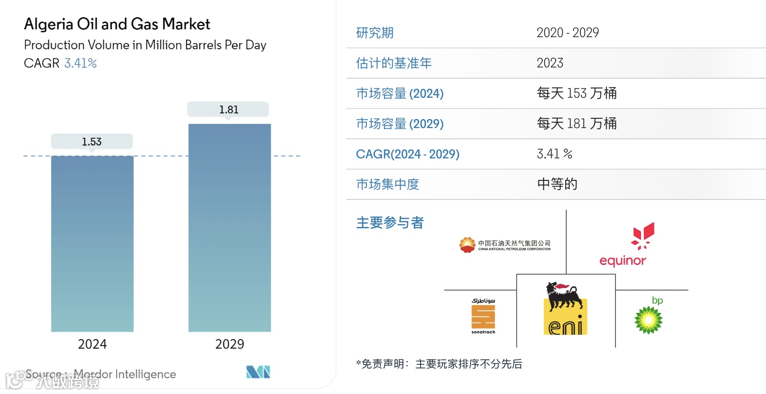 近年来国际油价长期走高,阿尔及利亚油气收入大增,经济稳步增长,经济重建全面开展。阿尔及利亚石油和天然气市场的产量规模预计将从2024年的153万桶/日增长到2029年的181万桶/日,预测期内(2024-2029年)复合年增长率为3.41%。