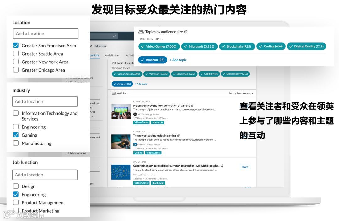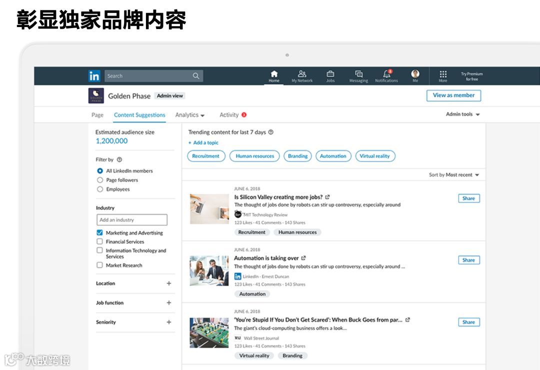 重点来了!公司页面上线了“内容推荐”这一全新功能,它可以帮助您在 LinkedIn 上洞悉您目标受众所关心的主题和内容趋势,借助这些数据和信息,策划和创建内容将变得更加轻松!
