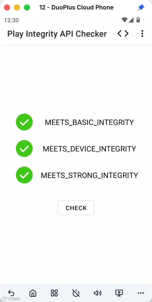 而DuoPlus云手机则是通过了Google Play的三层认证的云手机设备,包括Meets Basic Integrity (基本完整性)、Meets Device Integrity (设备完整性)和Meets Strong Integrity (强完整性),防风控能力大大增强。