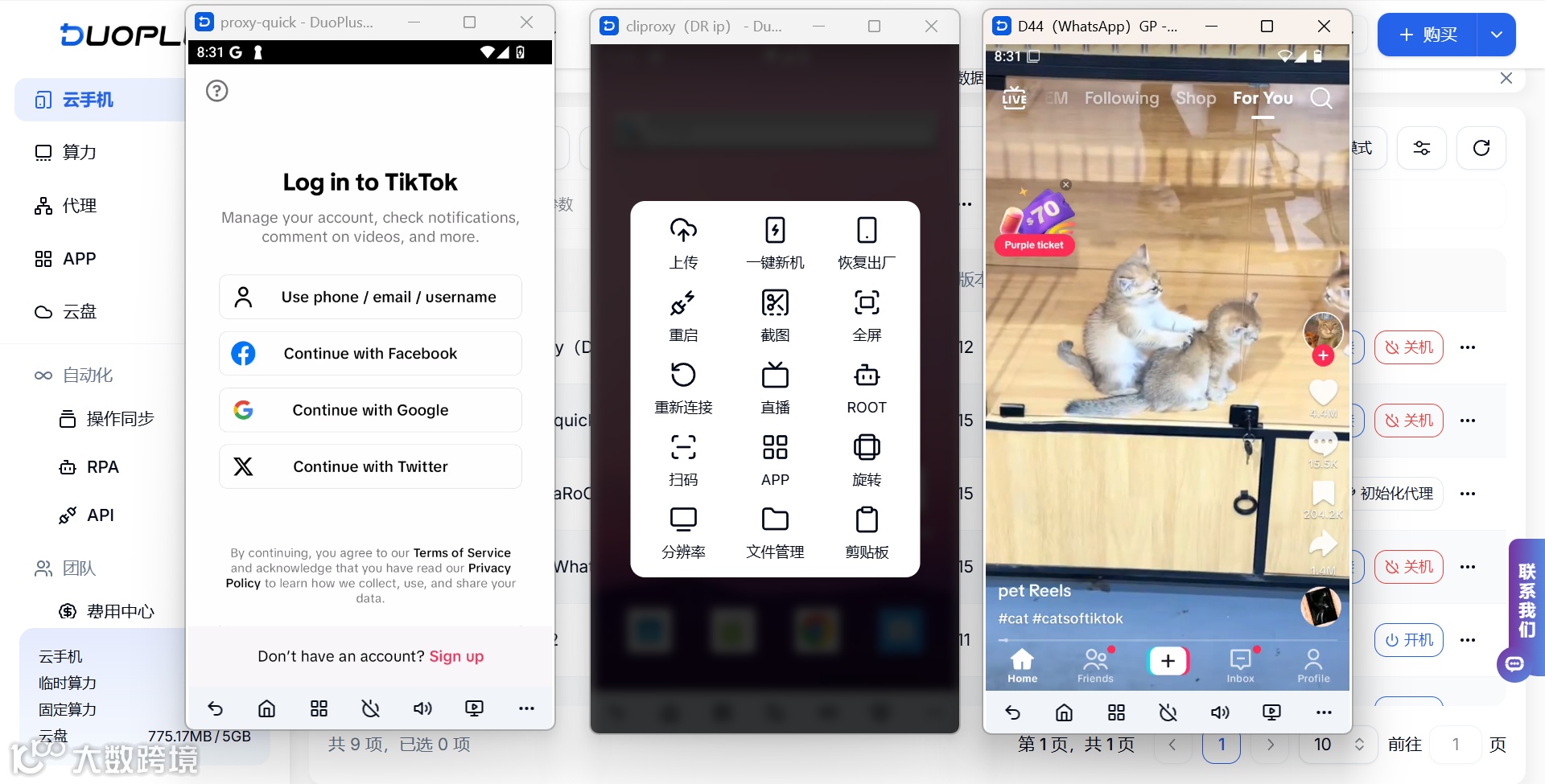 通过真实芯片硬件、Google三重认证和云端数据储存等云手机设置,DuoPlus云手机的仿真度更高,能够做到和真机一样的使用体验。