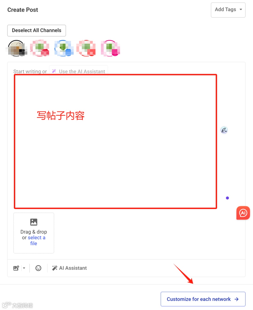 通过“All Channels”旁的“+”号,可同时向多个已绑定频道发布内容,实现一键多发。