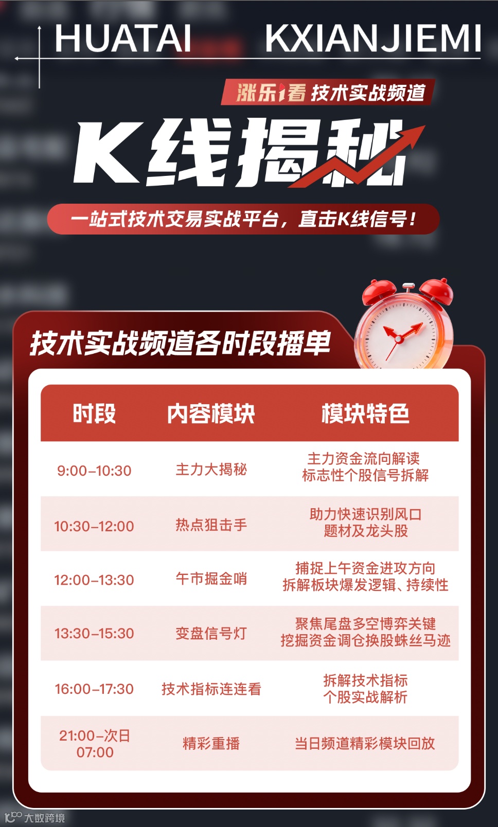技术实战频道是涨乐i看内容生态中专注实战技巧的一站式直播平台,以《K线揭秘》为核心栏目,贯穿全天交易时段。频道以当日盘中活跃个股为案例,实时解读交易工具与技术指标的应用方法,帮助用户将理论知识转化为实战能力。频道通过固定时段、体系化的内容输出,为用户提供持续、精细的技术指导。
