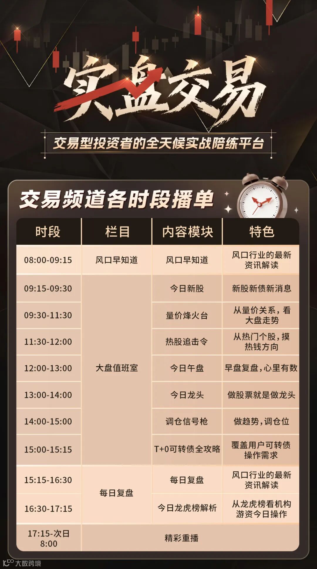 实盘交易频道旨在打造交易型投资者的全天候实战陪练平台”。结合交易日核心时段栏目设置与用户需求,突出“全时域覆盖、策略穿透、个股实战赋能”三大特色亮点。在全时域覆盖上,紧贴交易黄金窗口,