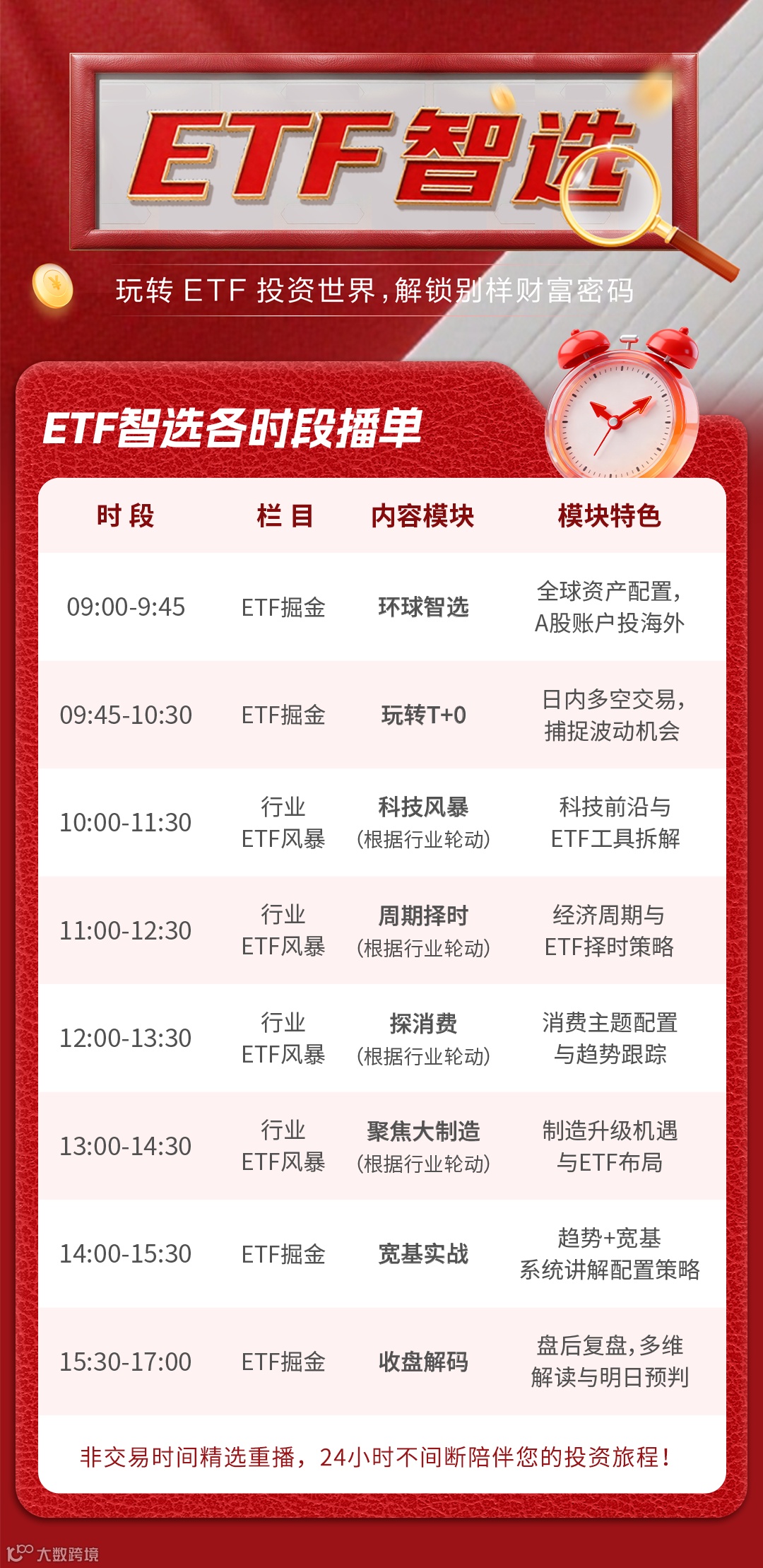 ETF智选频道是涨乐财富通推出的一站式ETF官方服务阵地,汇聚了一群兼具投资能力与专业能力的涨乐ETF明星嘉宾,每日早9点至晚17点直播,19点至次日9点重播,全天候陪伴您的投资旅程,我们不赌个股,只赢趋势!从宽基到行业,用简单的玩法,获取不简单的收益!