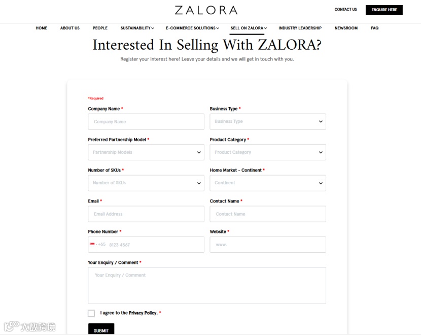 在Zalora官方的意向登记页面填写详细资料,包括公司名称、业务类型、首选合伙模式、产品分类、SKU 数量、意向市场、电子邮件、联系人姓名、电话号码、网站等,Zalora收到登记表后将与您取得联系。