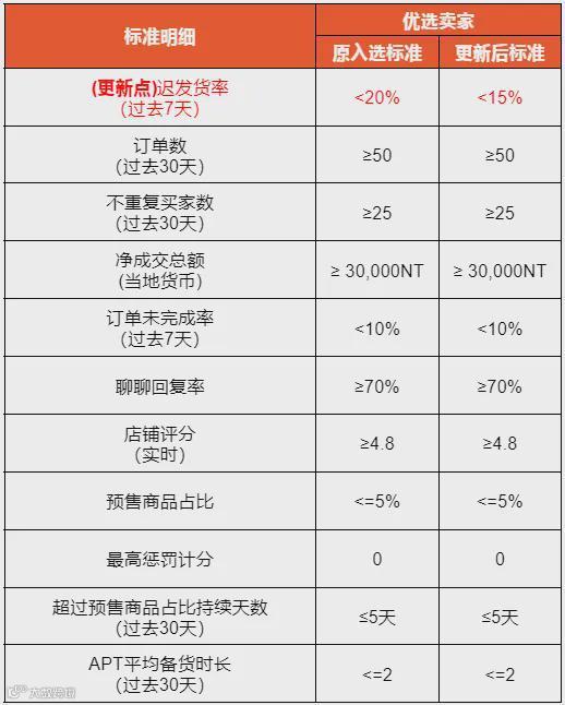 Shopee台湾跨境店将于6月24日更新优选卖家标准,更新标准如下: