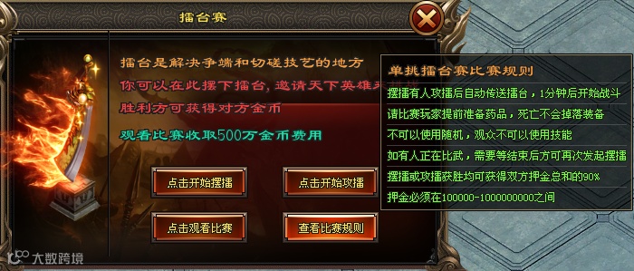 擂台是解决争端和切磋技艺的地方,每两名玩家可以前往NPC【擂台争霸】处单挑,胜利方可获得对方金币!
