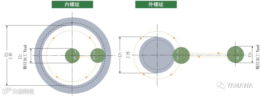 可以进行螺纹铣削的机床需带有三轴联动螺旋插补功能。螺旋插补是CNC控制系统指令刀具做螺旋回转移动的加工动作,它由以台面做螺旋回转并同时沿纵轴线性位移所组成。