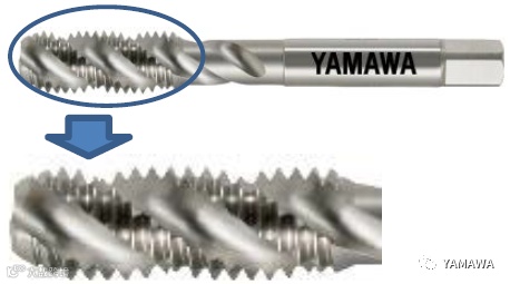 螺旋丝攻沟型就如下图,沟型呈现螺旋状,左图为丝攻连续加工切屑卷曲排屑会向后方排出,吃入部为2.5牙适合盲孔加工。