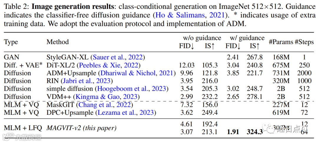 图像生成。本文在标准 ImageNet 类条件设置下对 MAGVIT-v2 的图像生成结果进行了评估。结果表明本文模型在采样质量(ID 和 IS)和推理时间效率(采样步骤)方面都超过了表现最好的扩散模型。