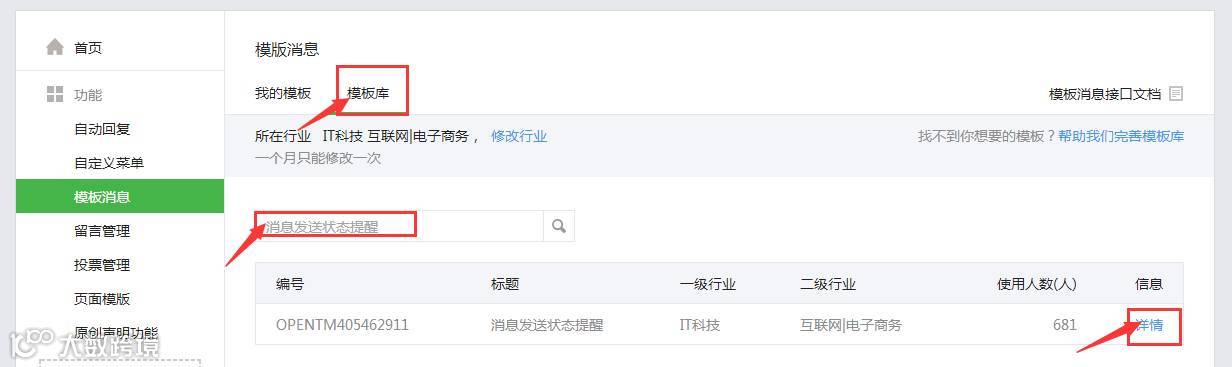 3.授权成功后,在公众号后台在【功能】内找到【模版消息】-【模版库】,搜索【消息发送状态提醒】,点击【详情】,选择【添加】;