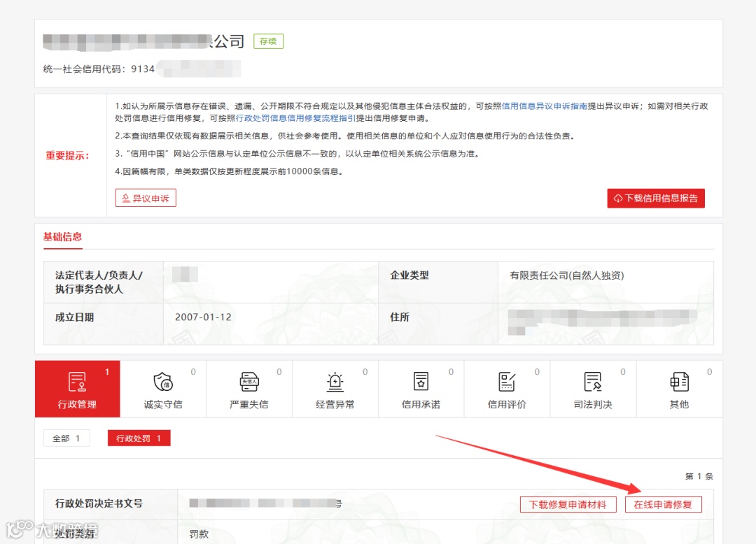 注意:若“在线申请修复”按钮为灰色,则表示最短公示期还未过