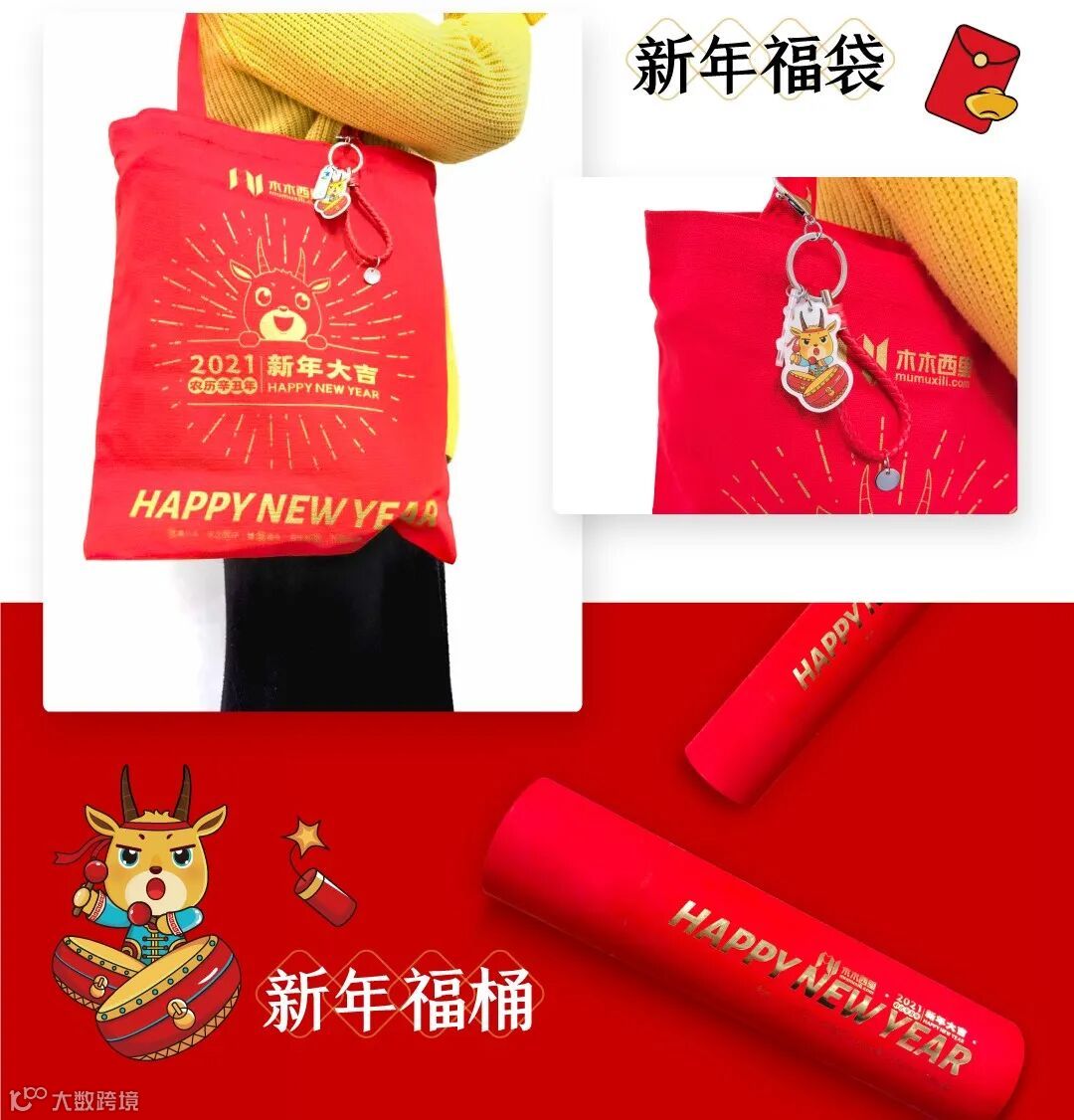 新年福桶中,我们放入了一副春联,两张福字,四张窗花,六个红包,六张寄语卡片,一只小楷毛笔。新年福袋上我们装饰了一个咩咩的卡通钥匙扣。