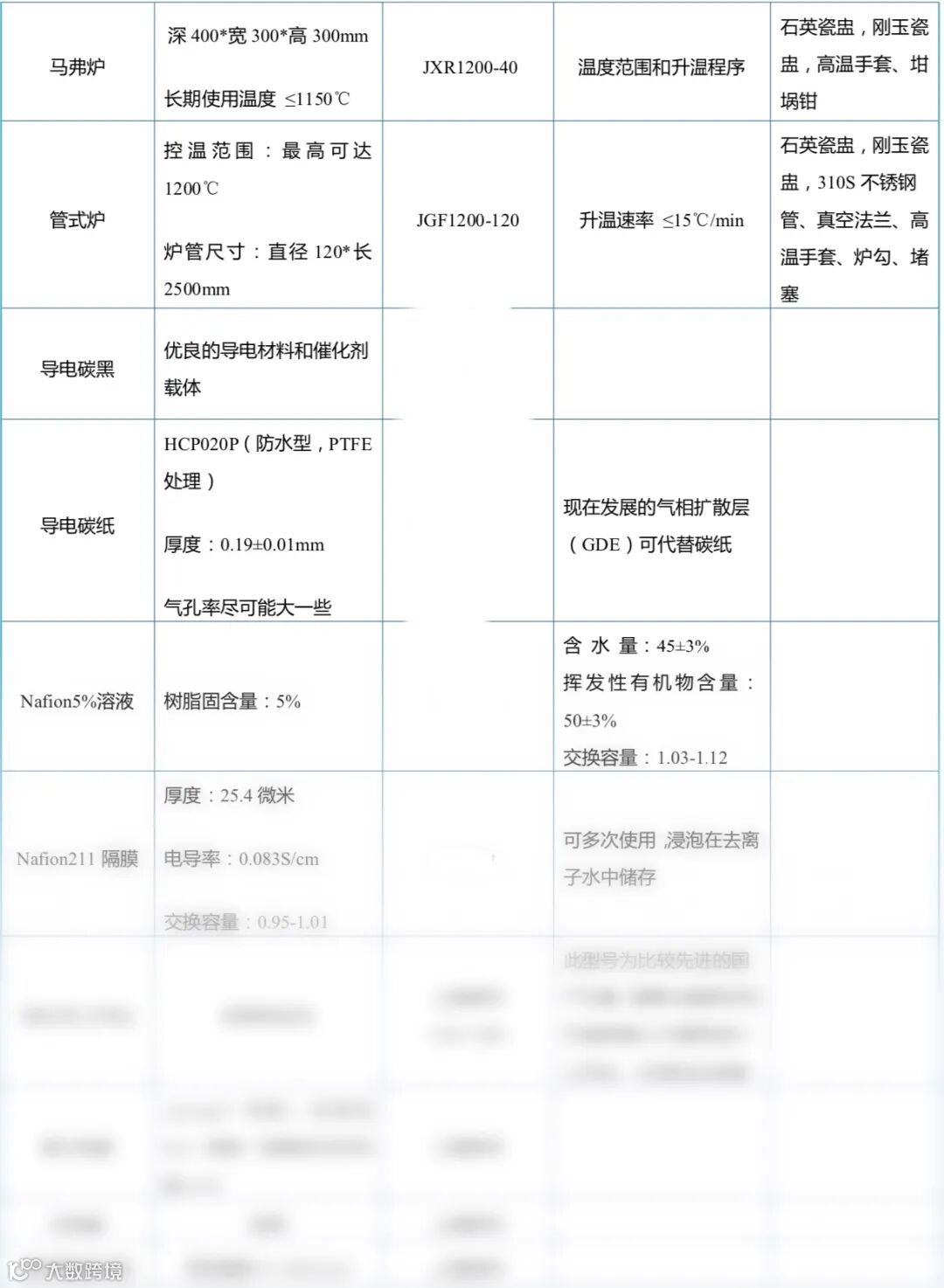 水热釜、管式炉、H 型电解槽、电化学工作站、气相色谱、核磁 共振波谱仪、蓝电测试系统