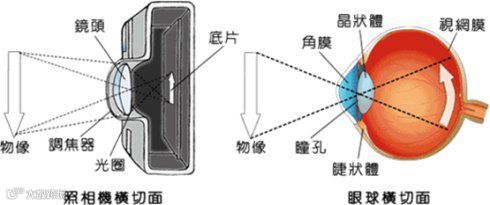 视网膜则相当于照相机的胶卷底片,起感光功能;而角膜和晶状体则相当于一组镜头,呈双凸透镜起屈光作用。